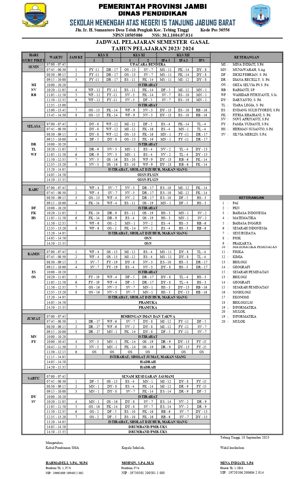 Jadwal Pelajaran dan Jadwal Pengajar SMA Negeri 15 Tanjung Jabung Barat Semester GasalTahun Pelajaran 2023-2024