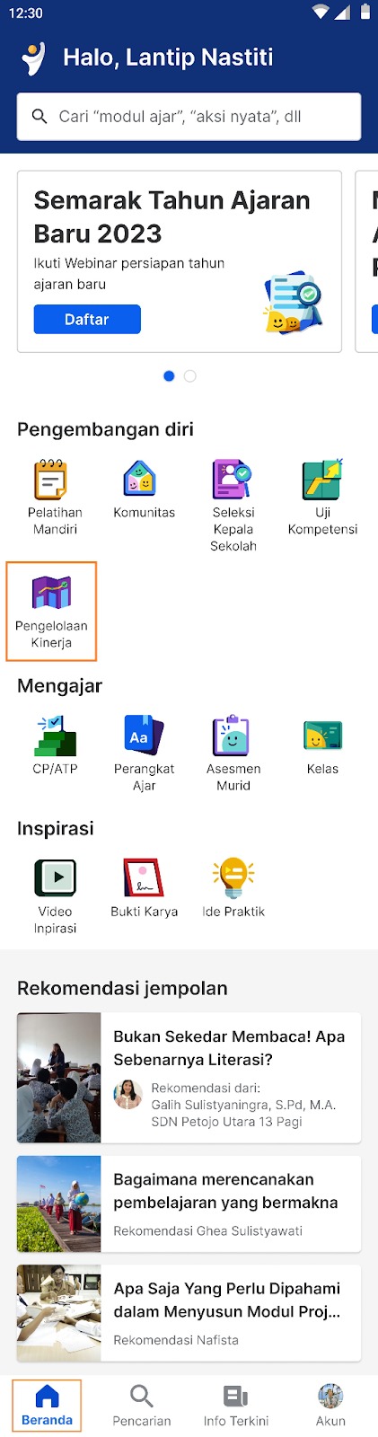 - Klik ‘Pengelolaan Kinerja’ pada menu Beranda di platform Merdeka Mengajar (PMM). Silakan akses melalui desktop atau laptop untuk mendapatkan pengalaman terbaik.