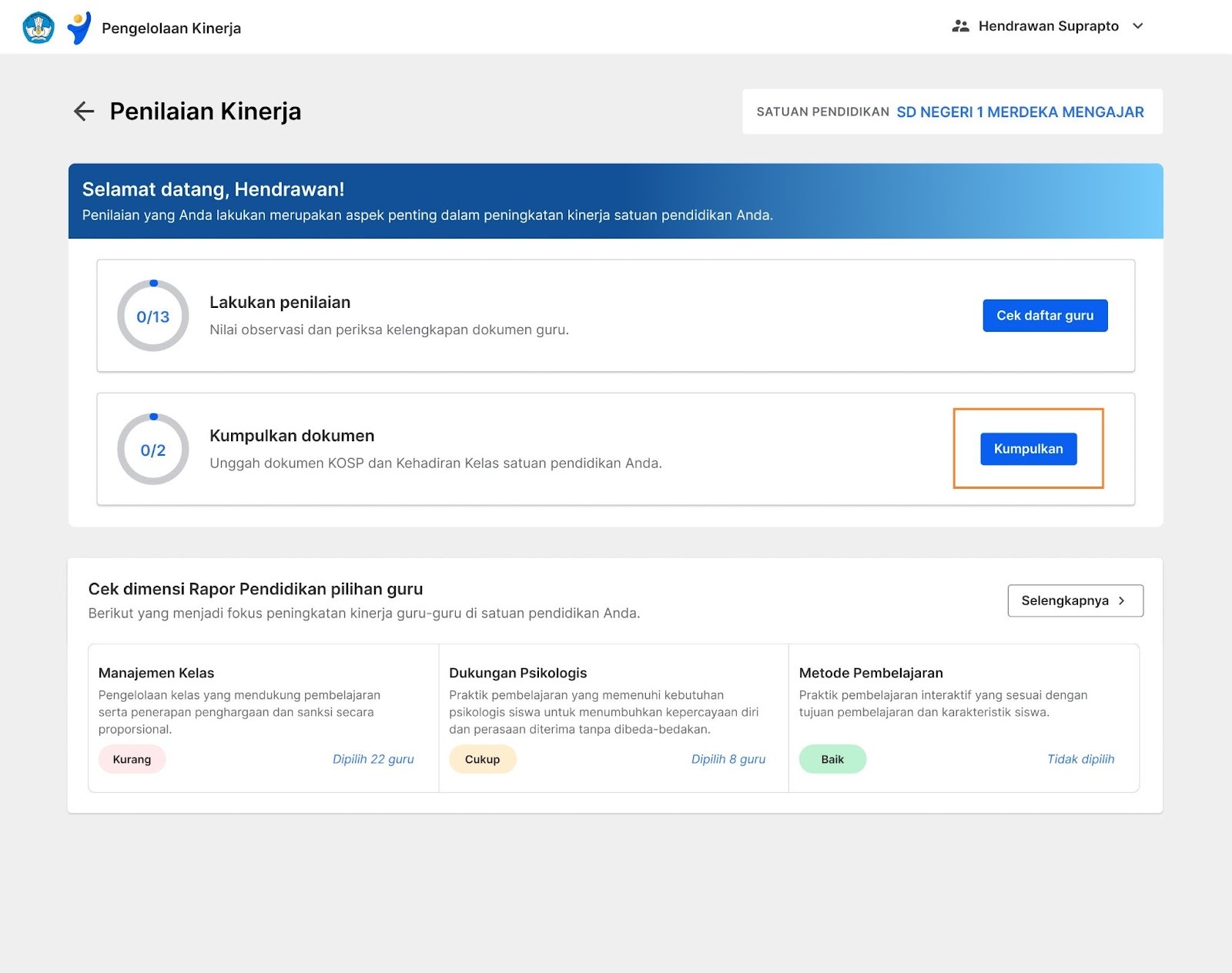 Pada tahap Penilaian Kinerja, Kepala Sekolah diminta untuk mengunggah bukti dukung berupa dokumen Kurikulum operasional di satuan pendidikan (KOSP) dan Kehadiran Kelas. Berikut panduan cara unggah bukti dukung pada tahap Penilaian Kinerja :