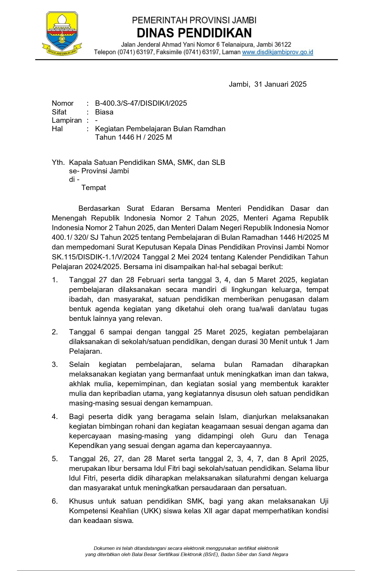 Menyambut bulan suci Ramadan 1446 H, SMAN 15 Tanjung Jabung Barat mengikuti arahan dari Dinas Pendidikan Provinsi Jambi sebagaimana tertuang dalam Surat Nomor B-400.3/S-47/DISDIK/I/2025 tertanggal 31 Januari 2025. Surat tersebut menjelaskan ketentuan pelaksanaan kegiatan pembelajaran selama bulan Ramadan, sebagai upaya penguatan karakter peserta didik sekaligus penghormatan terhadap suasana ibadah di bulan suci.