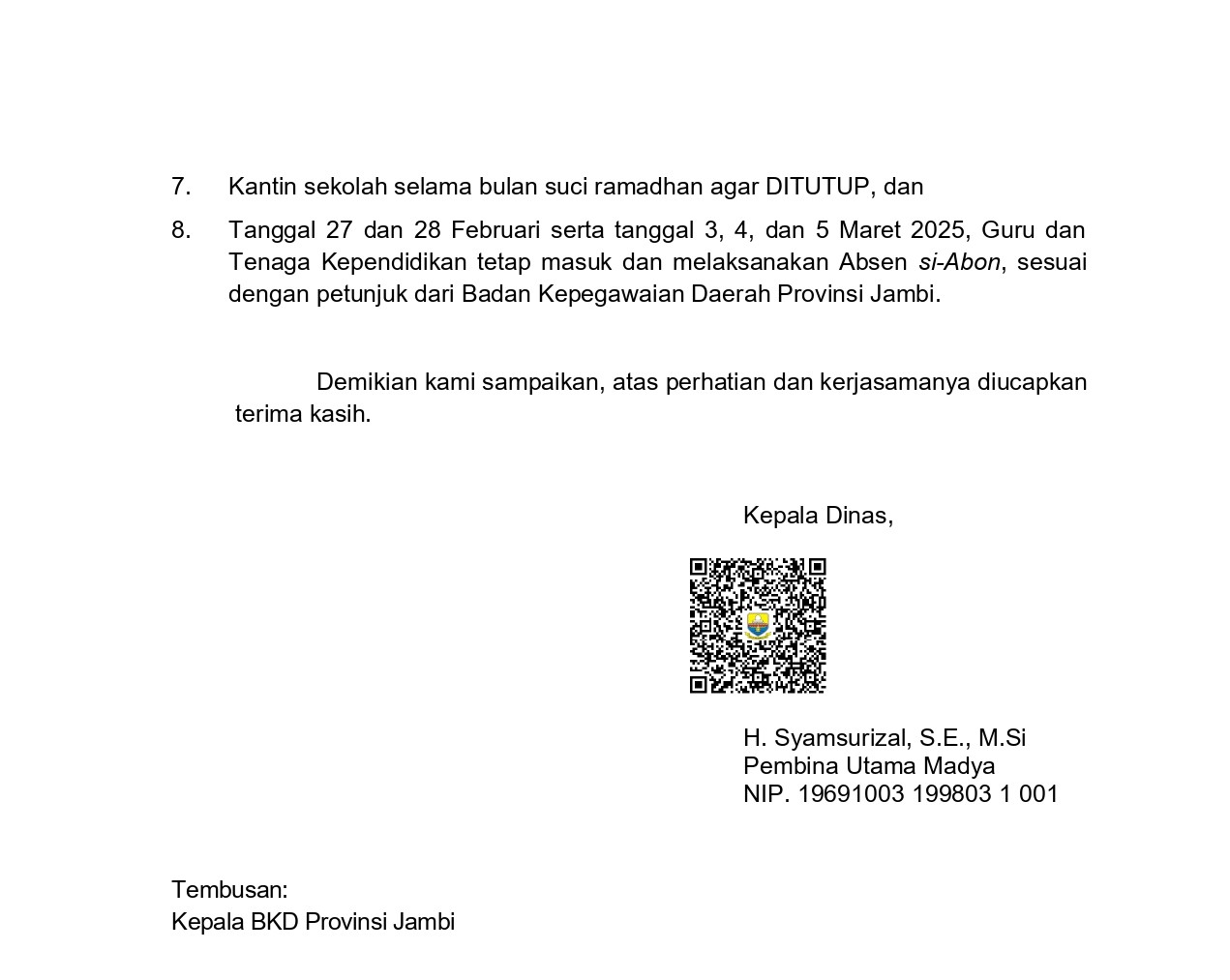 Kepala SMAN 15 Tanjung Jabung Barat, Bapak Mohsin, S.Pd., M.Si., turut mengimbau seluruh warga sekolah untuk menyambut bulan Ramadan dengan semangat ibadah, disiplin, dan saling menghormati. Ia juga menegaskan pentingnya pelaksanaan kebijakan ini secara tertib dan penuh tanggung jawab oleh seluruh guru, siswa, dan tenaga kependidikan di lingkungan sekolah.