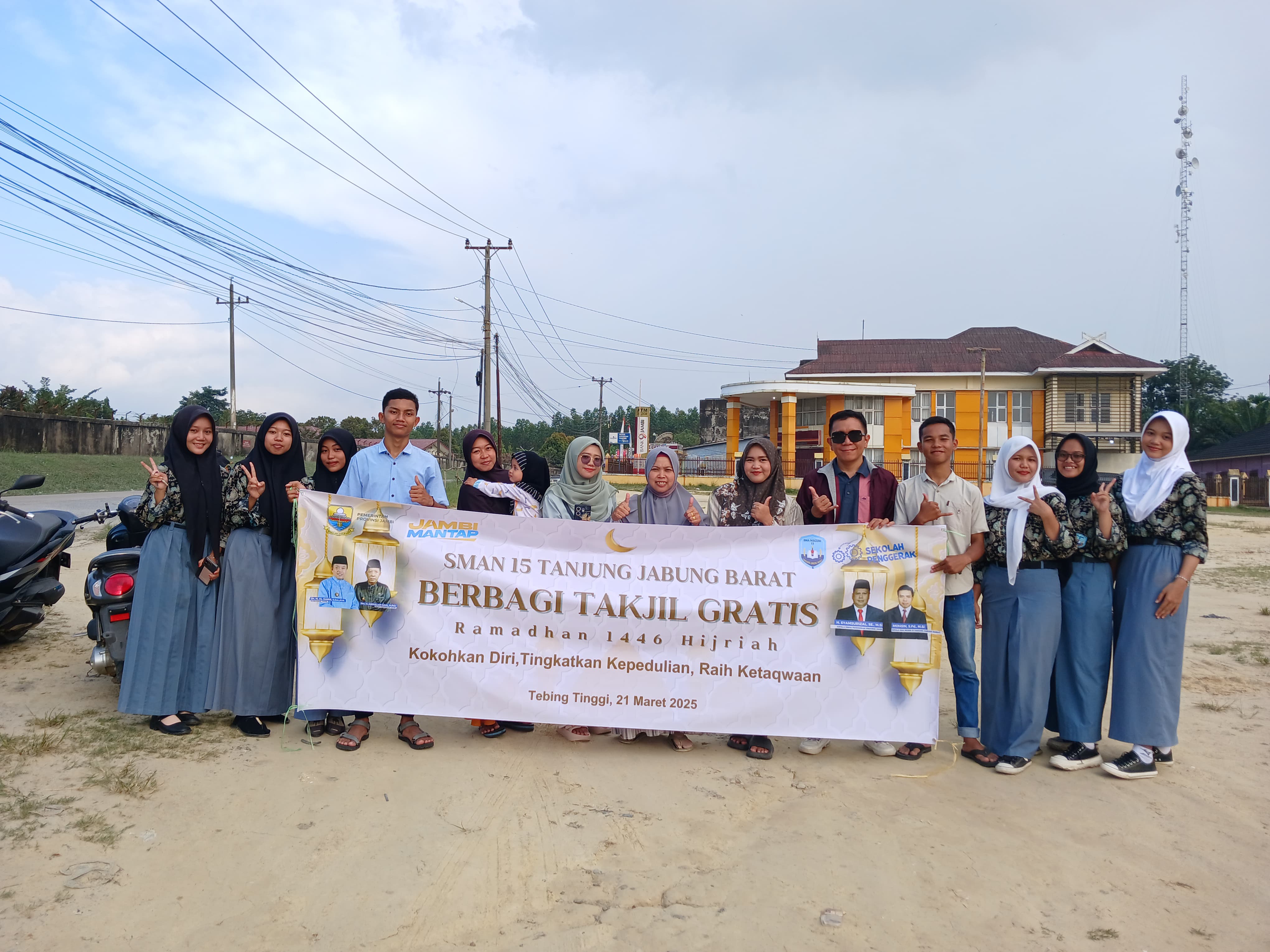 Sore menjelang buka puasa di Jalan Lintas KM 2,5 Desa Tebing Tinggi terasa beda dari biasanya. Di dua hari yang berbeda, tanggal 21 dan 26 Maret 2025, para pengurus OSIS SMAN 15 Tanjung Jabung Barat turun langsung ke jalan buat bagi-bagi takjil gratis ke warga sekitar. Aksi ini bukan sekadar bagi makanan, tapi juga bukti nyata bahwa peduli itu keren!